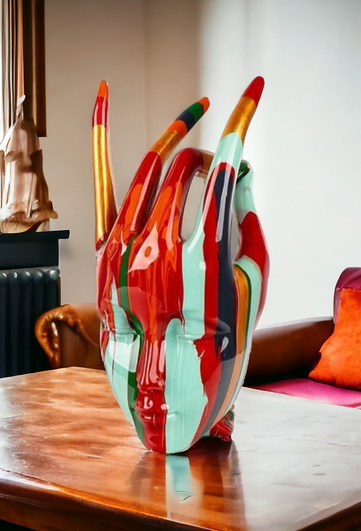 A masterpiece that redefines contemporary home decor – our Abstract Multicolor Hand Sculpture. This stunning piece seamlessly blends modern artistry with vibrant hues, creating a focal point in any room. The dynamic, hand-shaped design is adorned with bold, flowing stripes of red, orange, turquoise, and more, making it an eye-catching addition to your living space.
